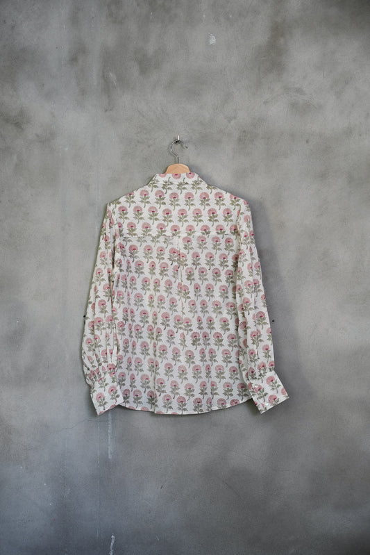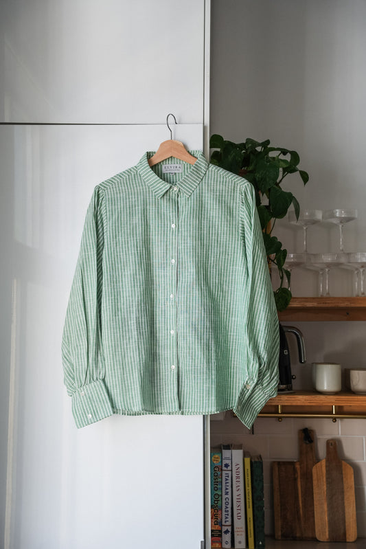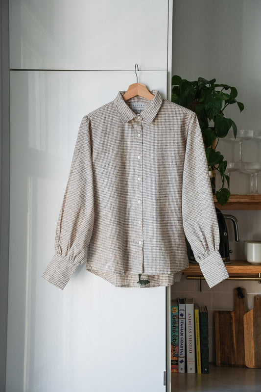 Her har vi designet en feminin skjortemodell med litt puffy armer og...
