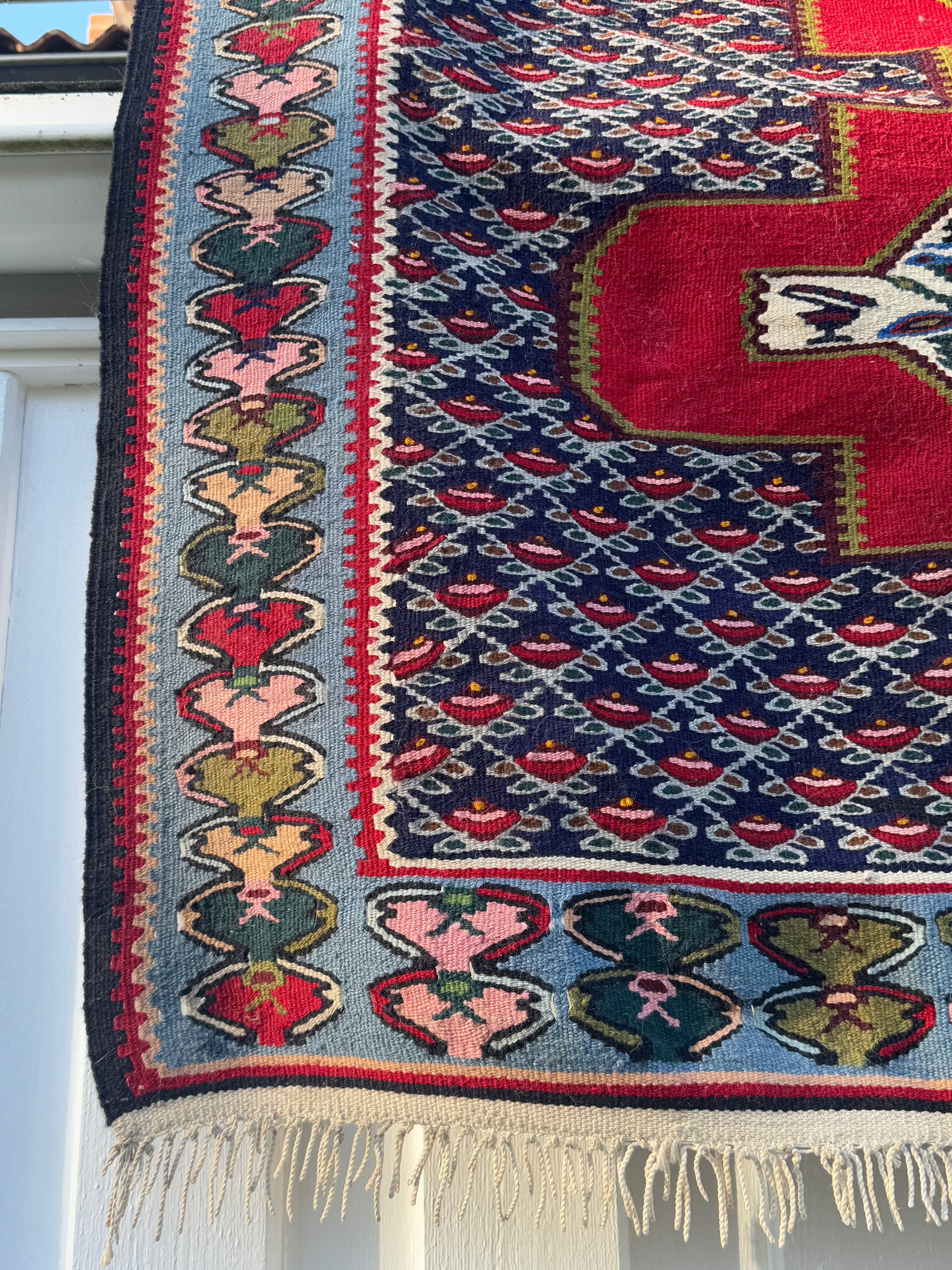 Et håndvevd kelimteppe med opprinnelse fra Teheran, kjøpt for over 30 år siden. Teppets mønster og fargebruk bærer preg av den tidløse persiske tradisjonen – geometriske former, dype nyanser og en harmonisk balanse mellom varme og kjølige toner.