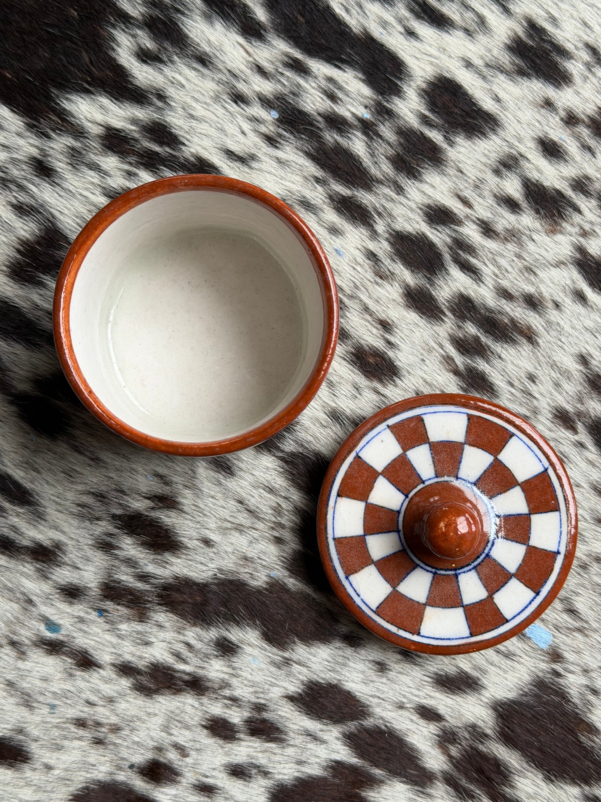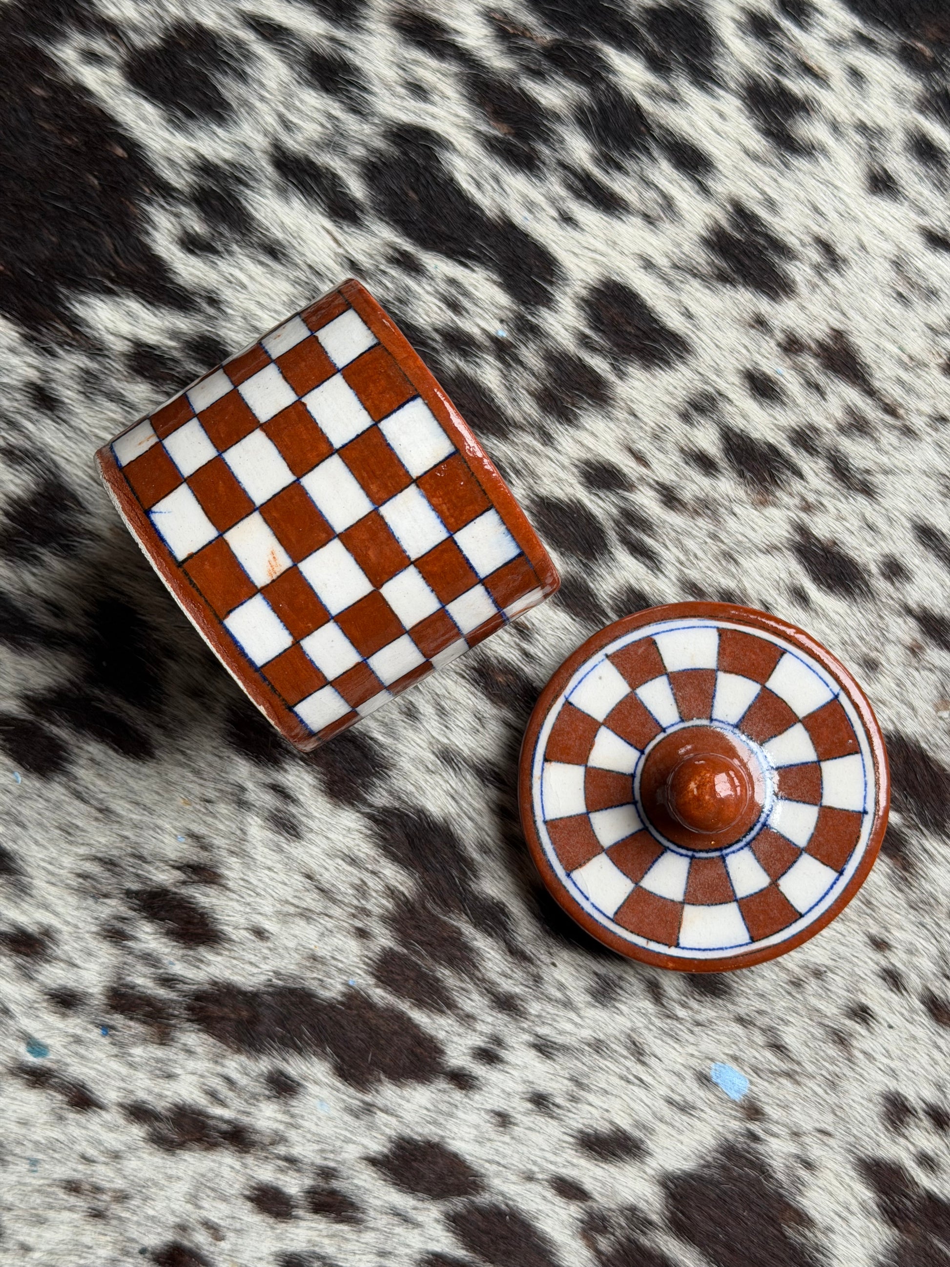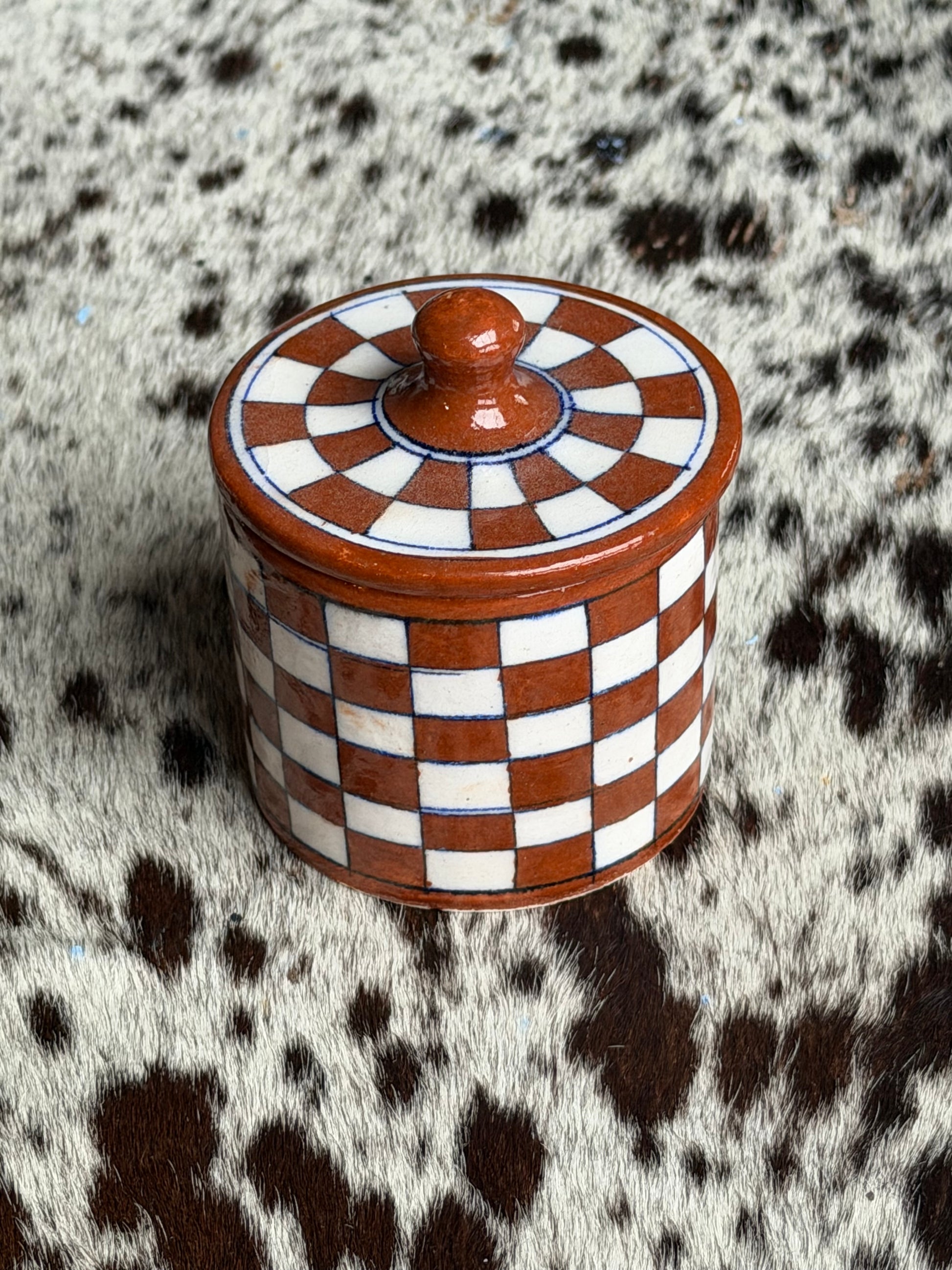 Keramikkboks med lokk med håndmalte ruter. Passer fint til alt fra syltetøy og sukker til oppbevaring av småting eller bomullspads.