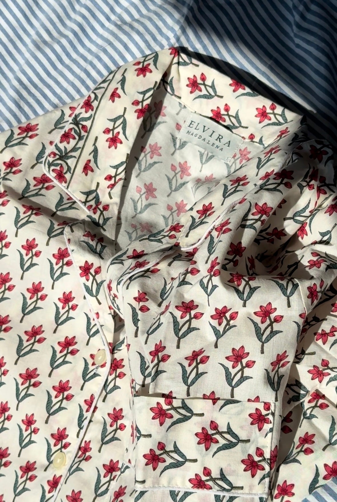 Pysjamasen er som et lite kunstverk i seg selv, med levende mønstre og delikate detaljer. Laget i florlett bomull som puster godt og gir en sval følelse.