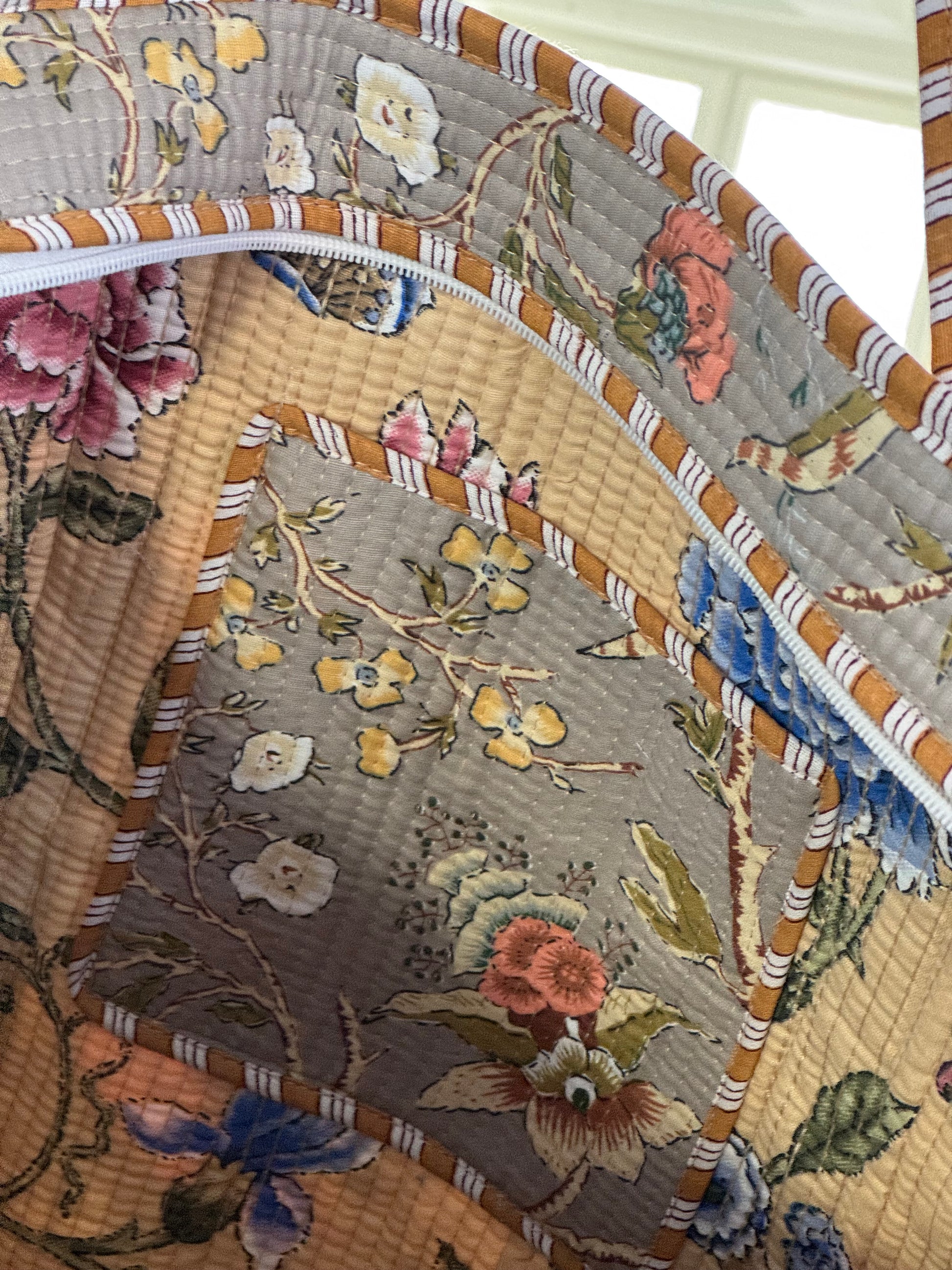 En lett og romslig bag i bomull, perfekt som følgesvenn til stranden, på reise, til hverdags/jobb eller yoga. Stoffet er blokktrykket for hånd i India, og hver bag har sitt eget særpreg. Glidelås på toppen, innvendig lomme og myke, brede stropper gjør den både praktisk og behagelig å bære.