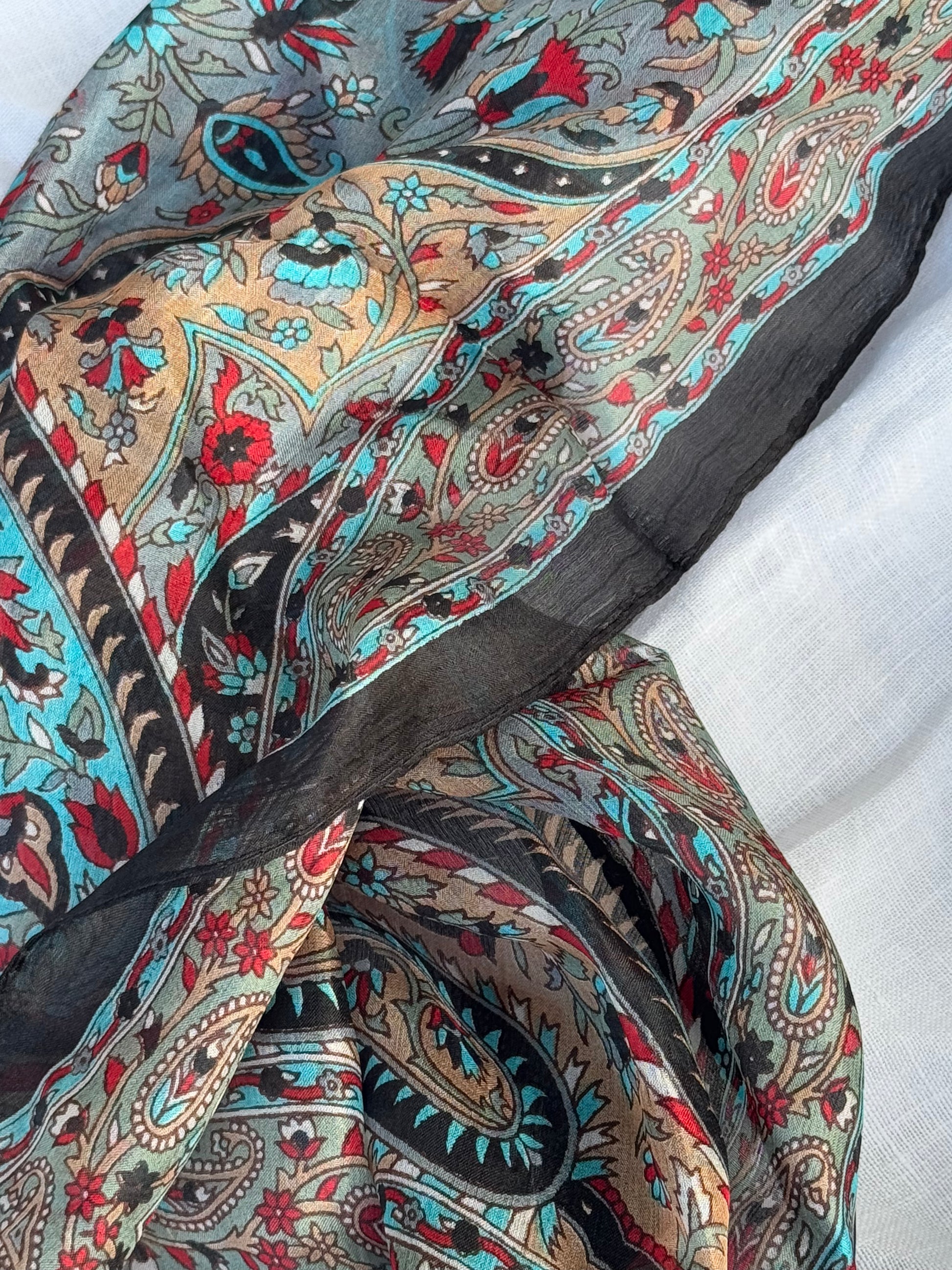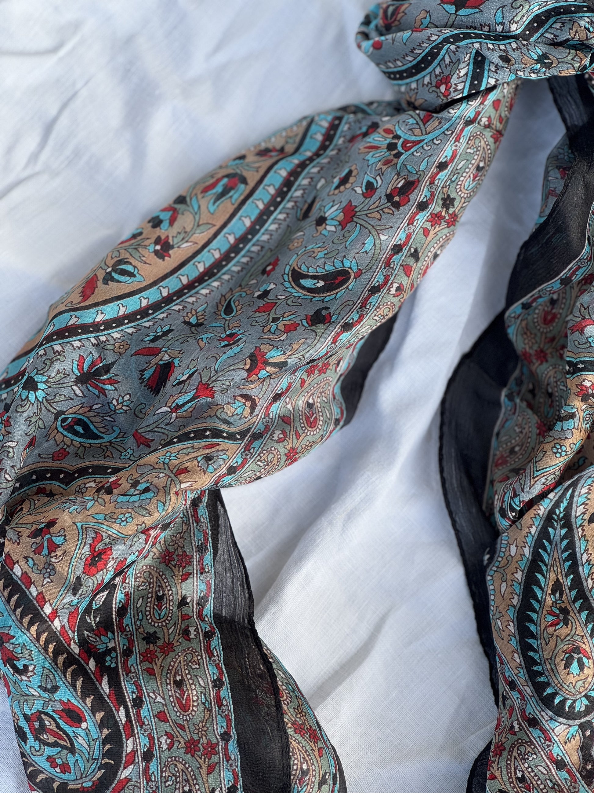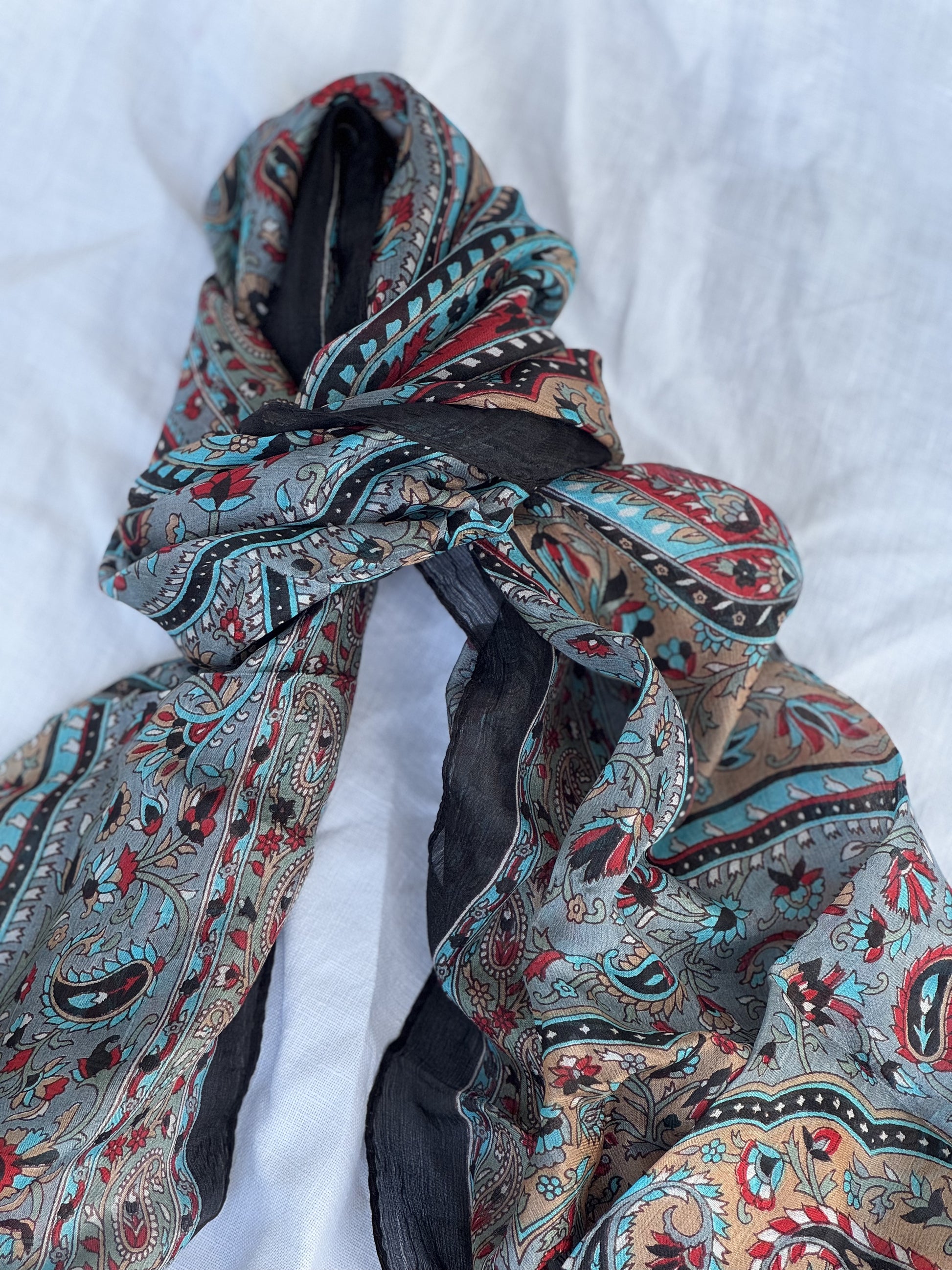 Skjerf i lett silke som måler 170x50cm. Faller pent rundt halsen, og kan brukes året rundt. En fin detalj som løfter ethvert antrekk. Kan knytes på mange forskjellige måter, og varmer godt dersom du surrer det flere ganger rundt halsen.