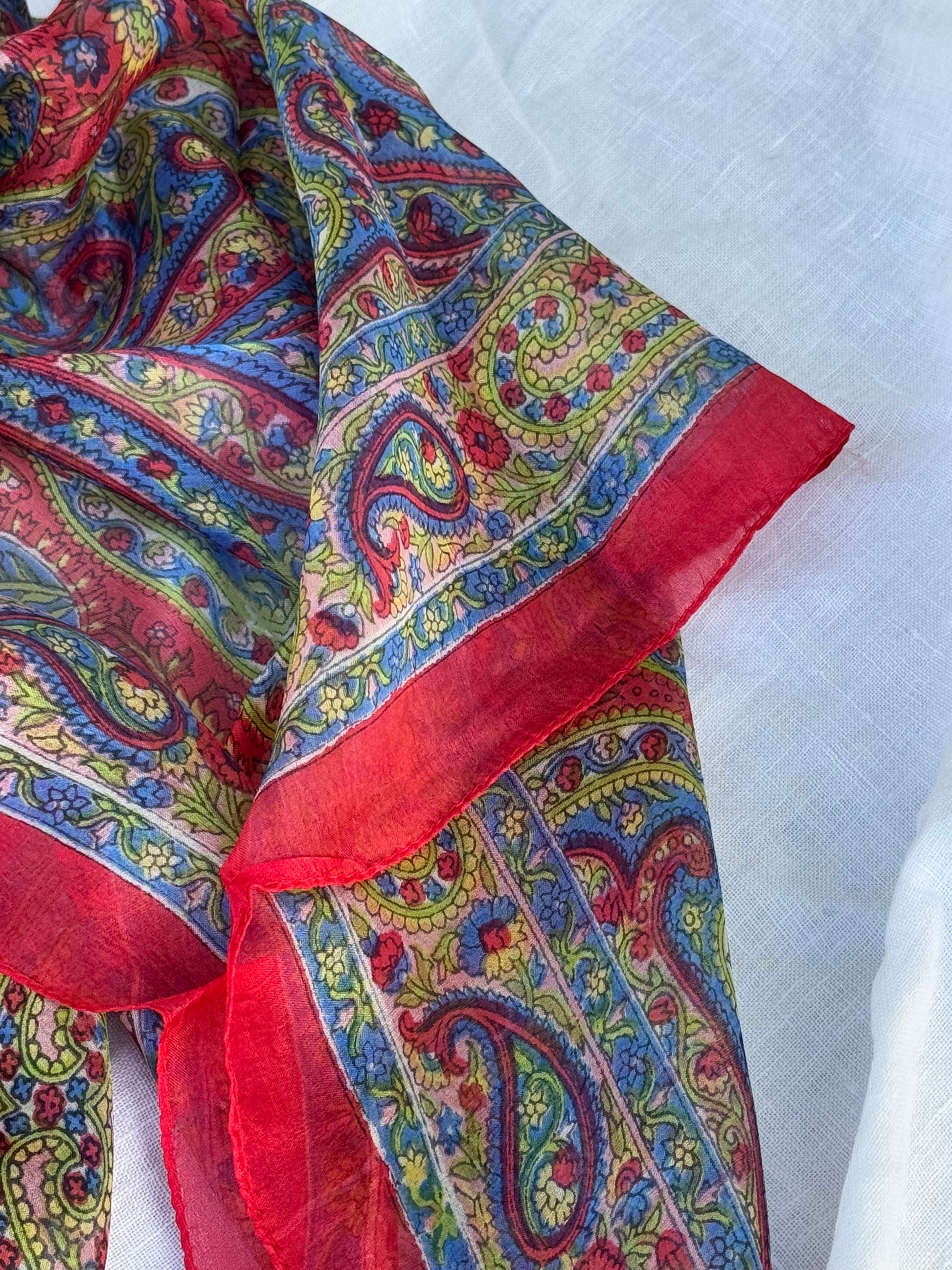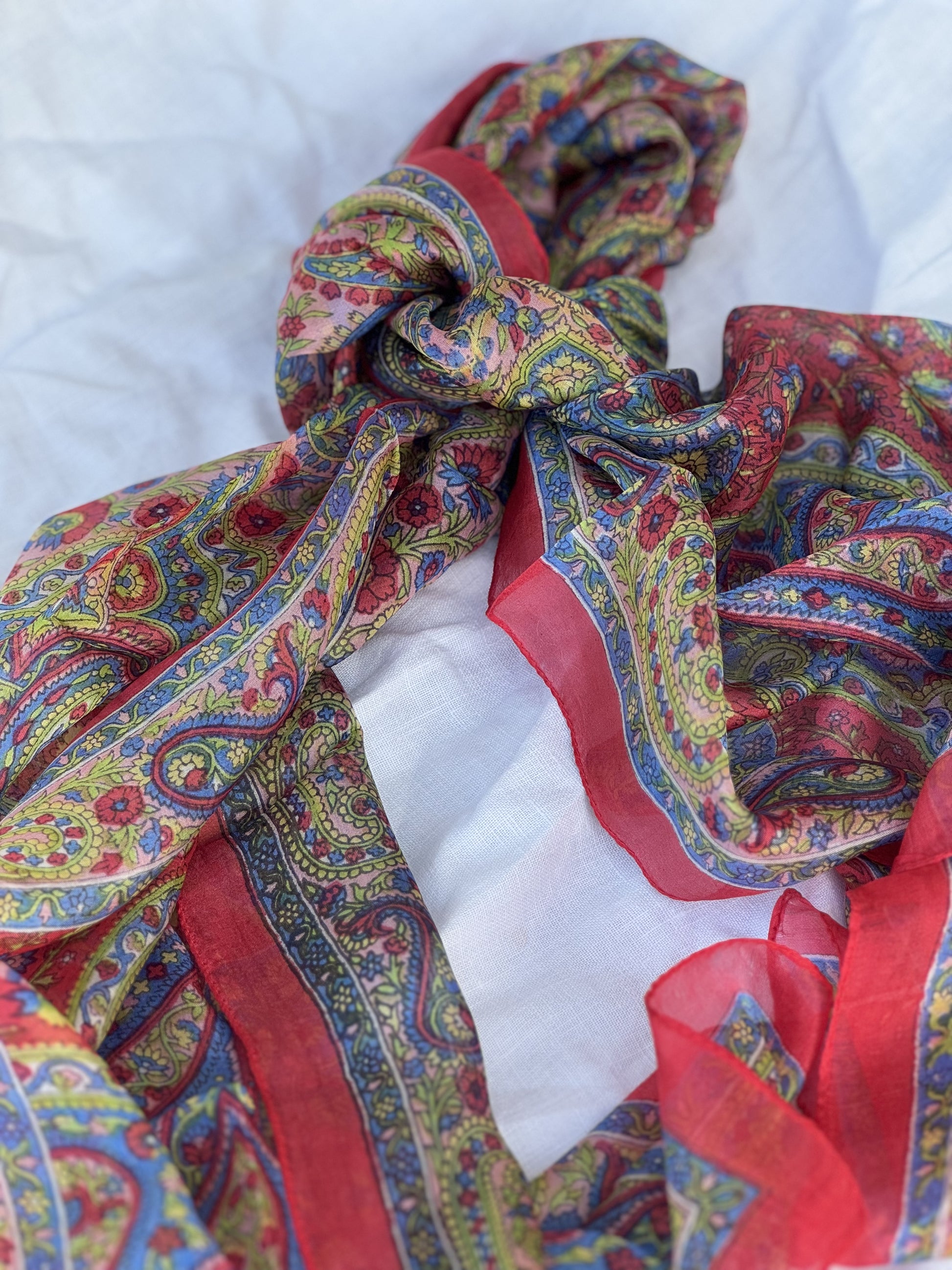 Skjerf i lett silke som måler 170x50cm. Faller pent rundt halsen, og kan brukes året rundt. En fin detalj som løfter ethvert antrekk. Kan knytes på mange forskjellige måter, og varmer godt dersom du surrer det flere ganger rundt halsen.