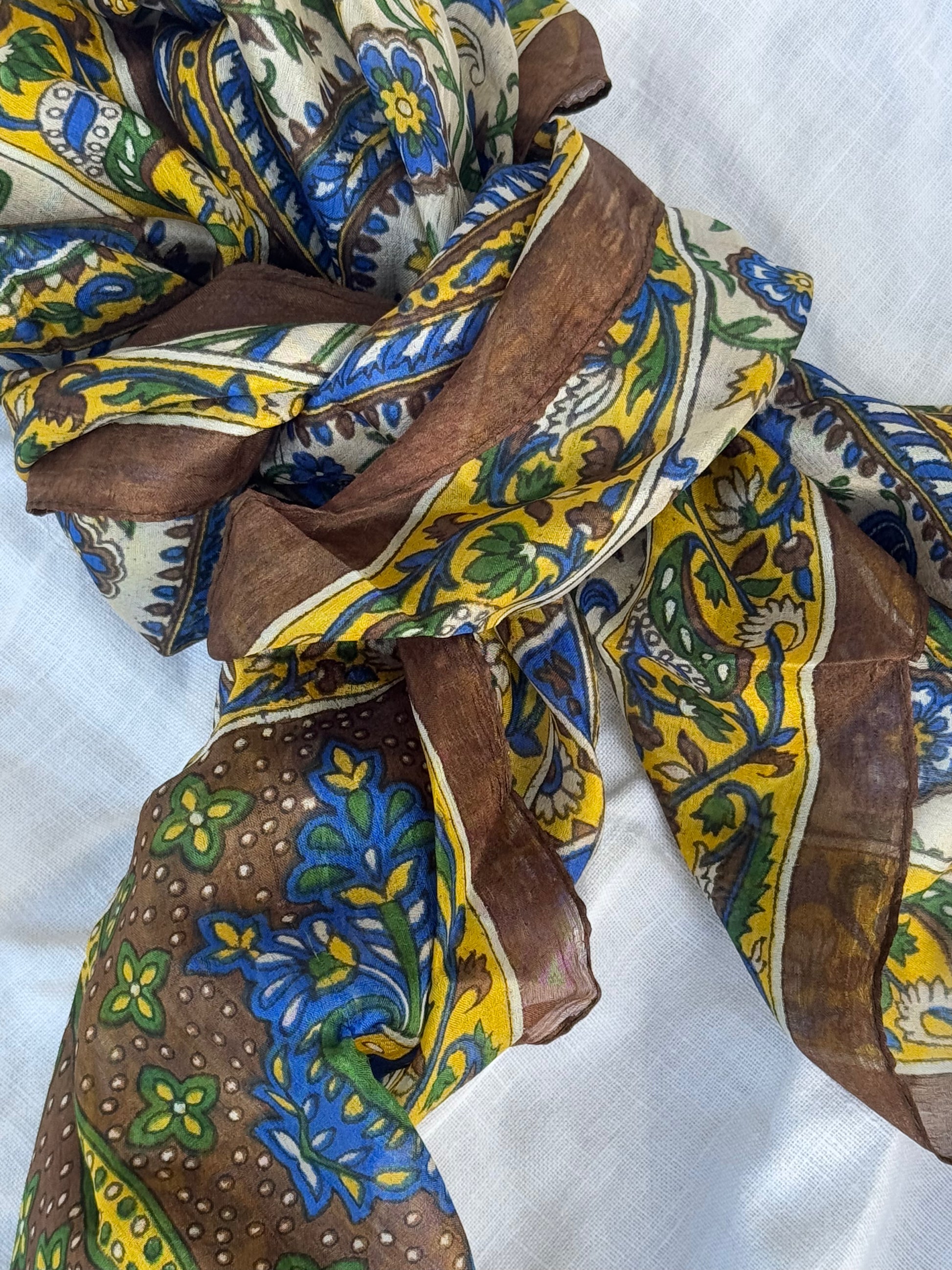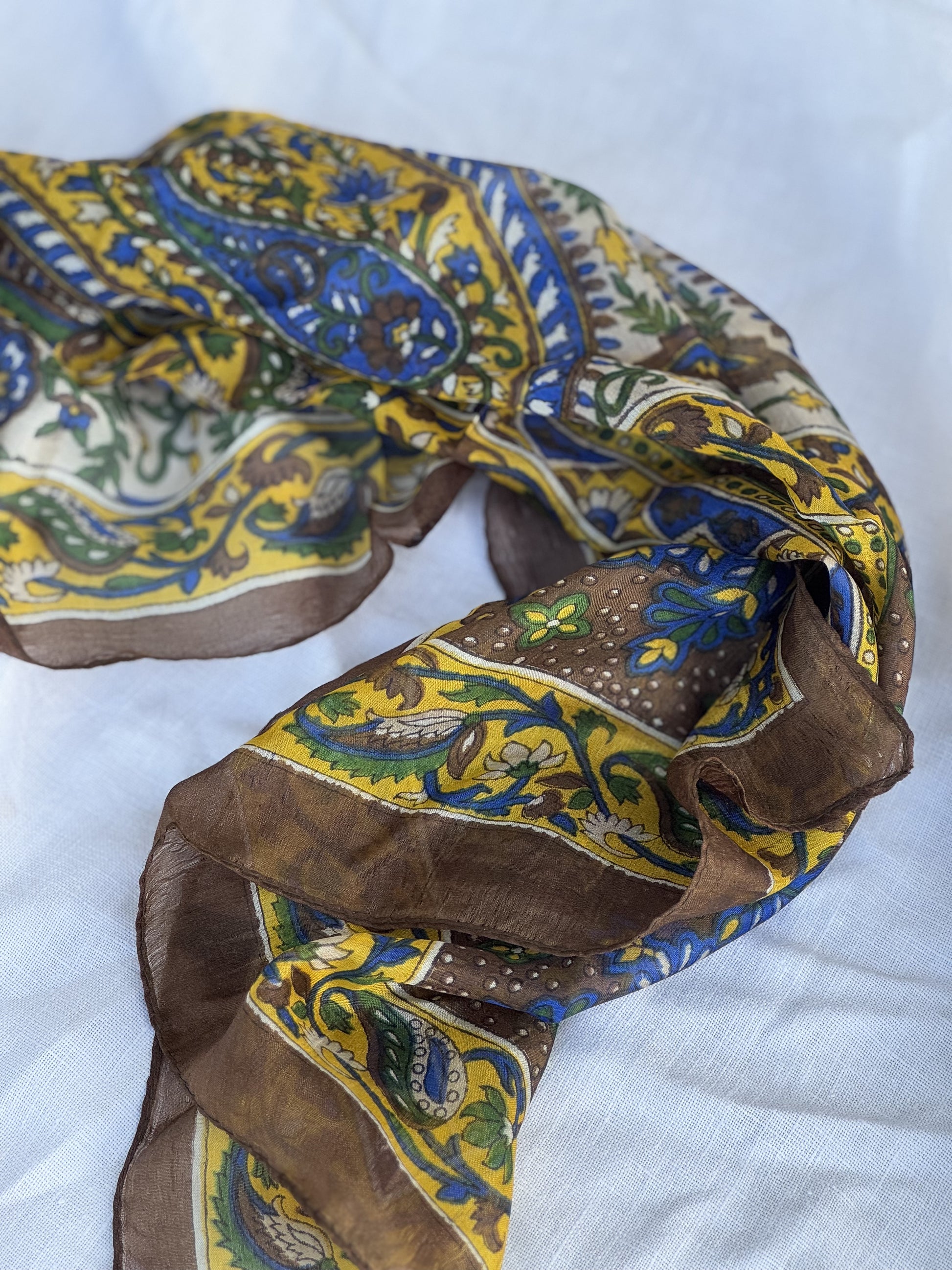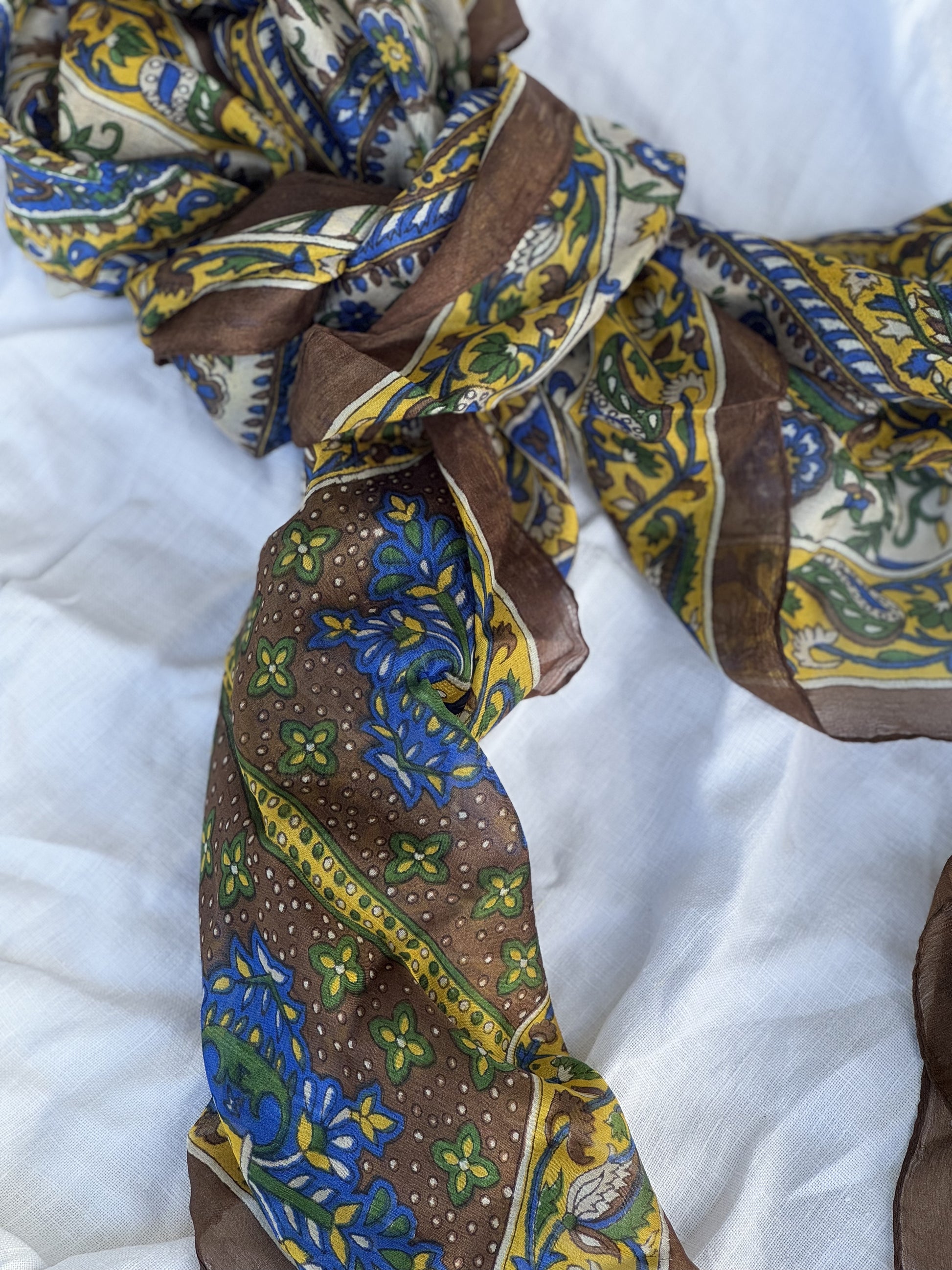Skjerf i lett silke som måler 170x50cm. Faller pent rundt halsen, og kan brukes året rundt. En fin detalj som løfter ethvert antrekk. Kan knytes på mange forskjellige måter, og varmer godt dersom du surrer det flere ganger rundt halsen.