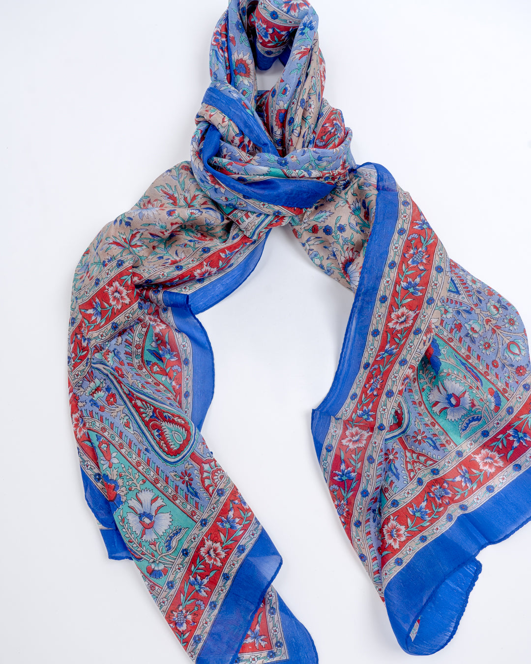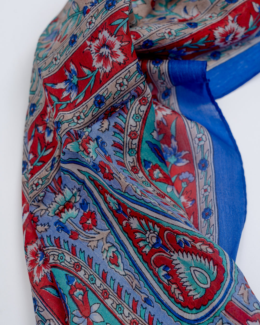 Skjerf i lett silke som måler 170x50cm. Faller pent rundt halsen, og kan brukes året rundt. En fin detalj som løfter ethvert antrekk. Kan knytes på mange forskjellige måter, og varmer godt dersom du surrer det flere ganger rundt halsen.