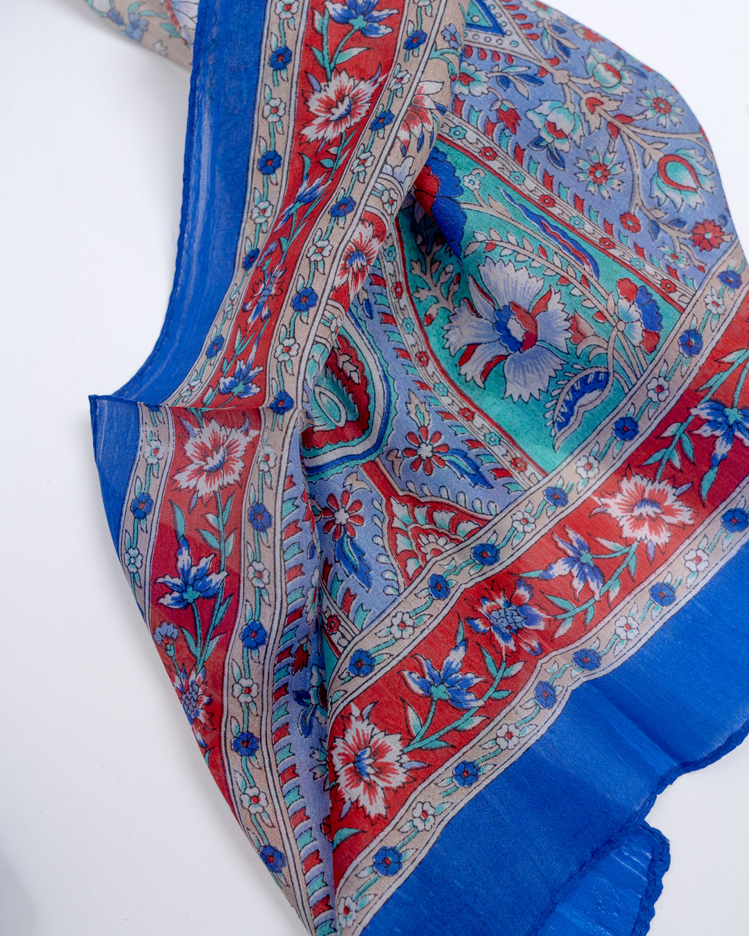 Dette er så tynt som silke kan veves – et ultralett skjerf som nesten ikke merkes mot huden og det får plass i små vesker og lommer. På grunn av den fine vevingen kan enkelte silkefibre stikke litt ut langs sømmene. Disse er det bare å klippe bort.