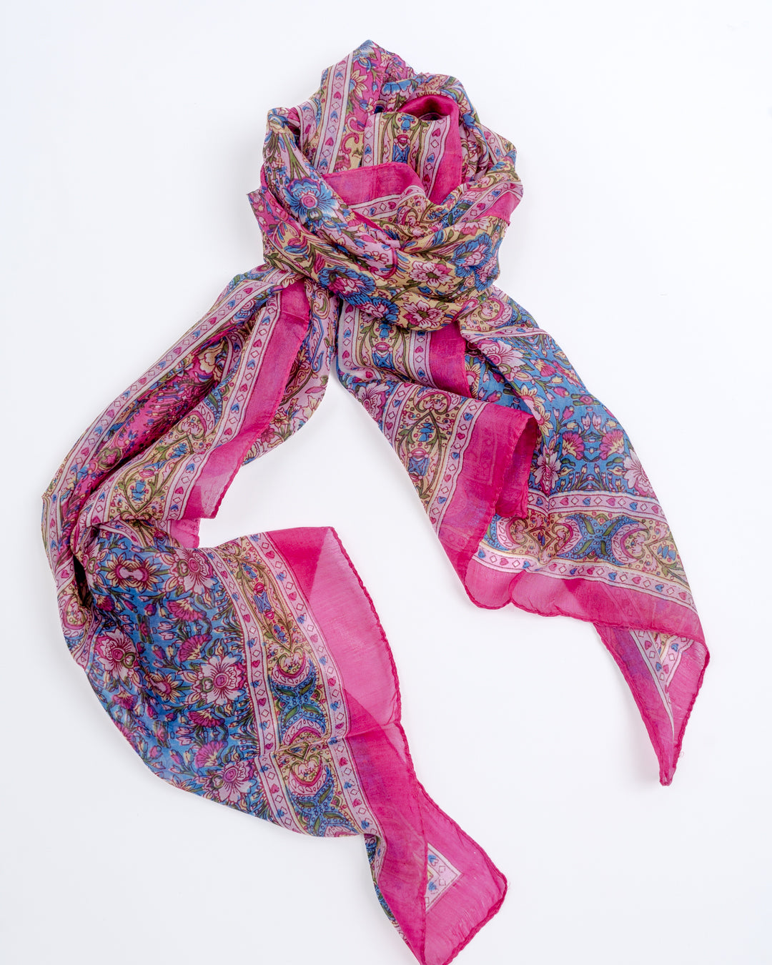 Skjerf i lett silke som måler 170x50cm. Faller pent rundt halsen, og kan brukes året rundt. En fin detalj som løfter ethvert antrekk. Kan knytes på mange forskjellige måter, og varmer godt dersom du surrer det flere ganger rundt halsen.