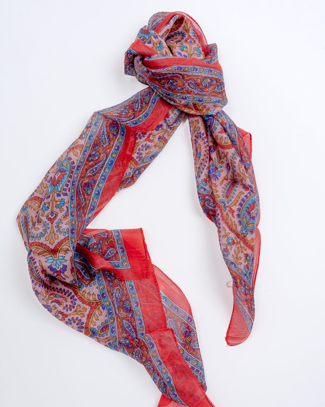 Skjerf i lett silke som måler 170x50cm. Faller pent rundt halsen, og kan brukes året rundt. En fin detalj som løfter ethvert antrekk. Kan knytes på mange forskjellige måter, og varmer godt dersom du surrer det flere ganger rundt halsen.