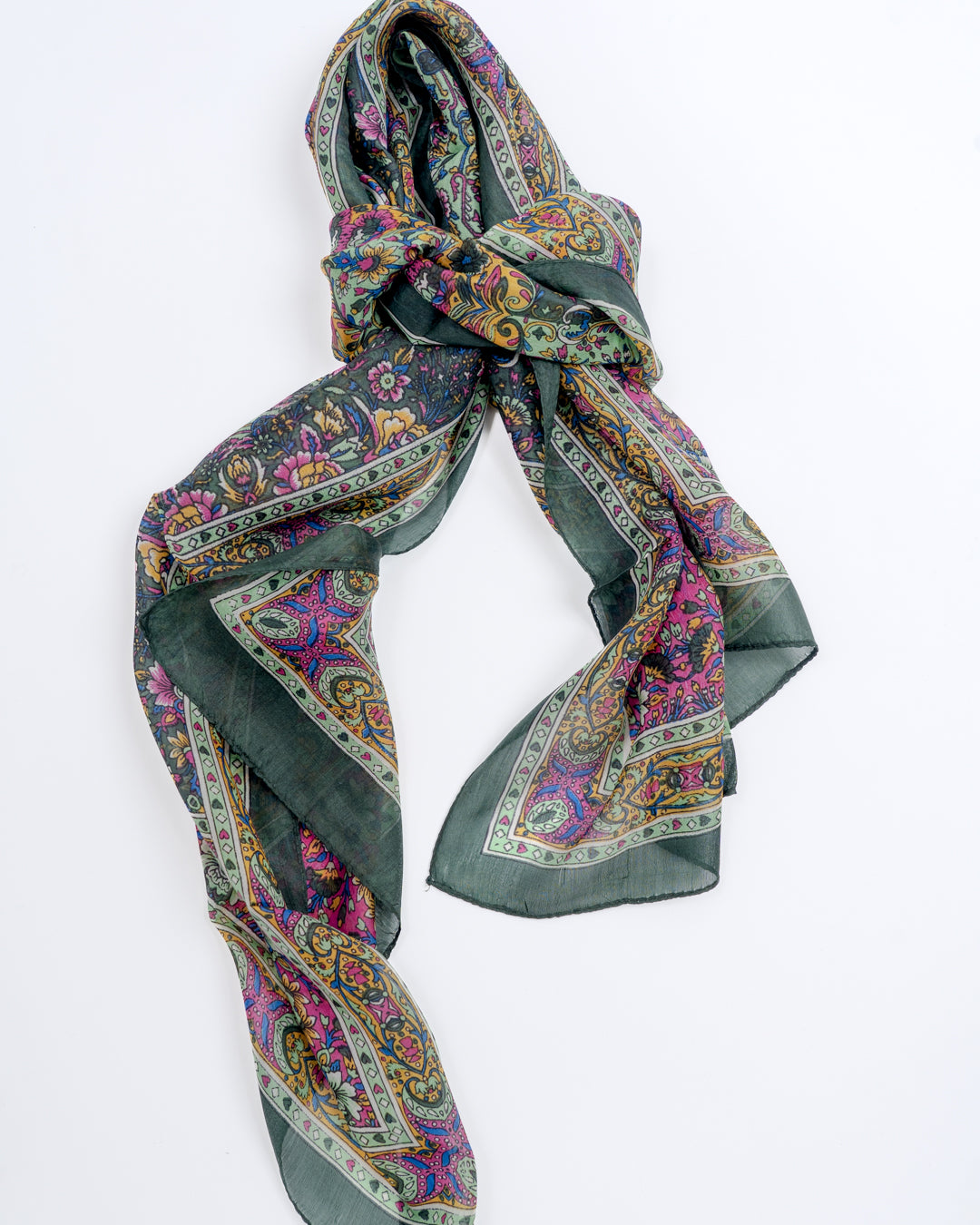 Skjerf i lett silke som måler 170x50cm. Faller pent rundt halsen, og kan brukes året rundt. En fin detalj som løfter ethvert antrekk. Kan knytes på mange forskjellige måter, og varmer godt dersom du surrer det flere ganger rundt halsen.