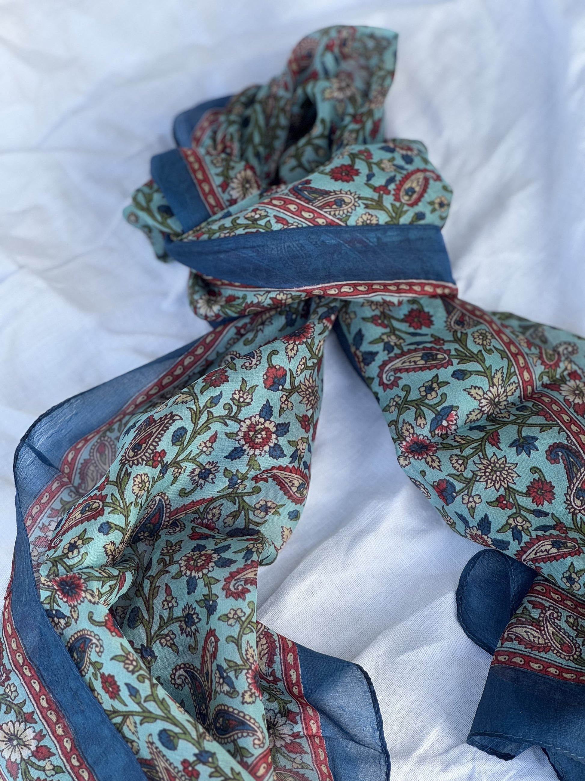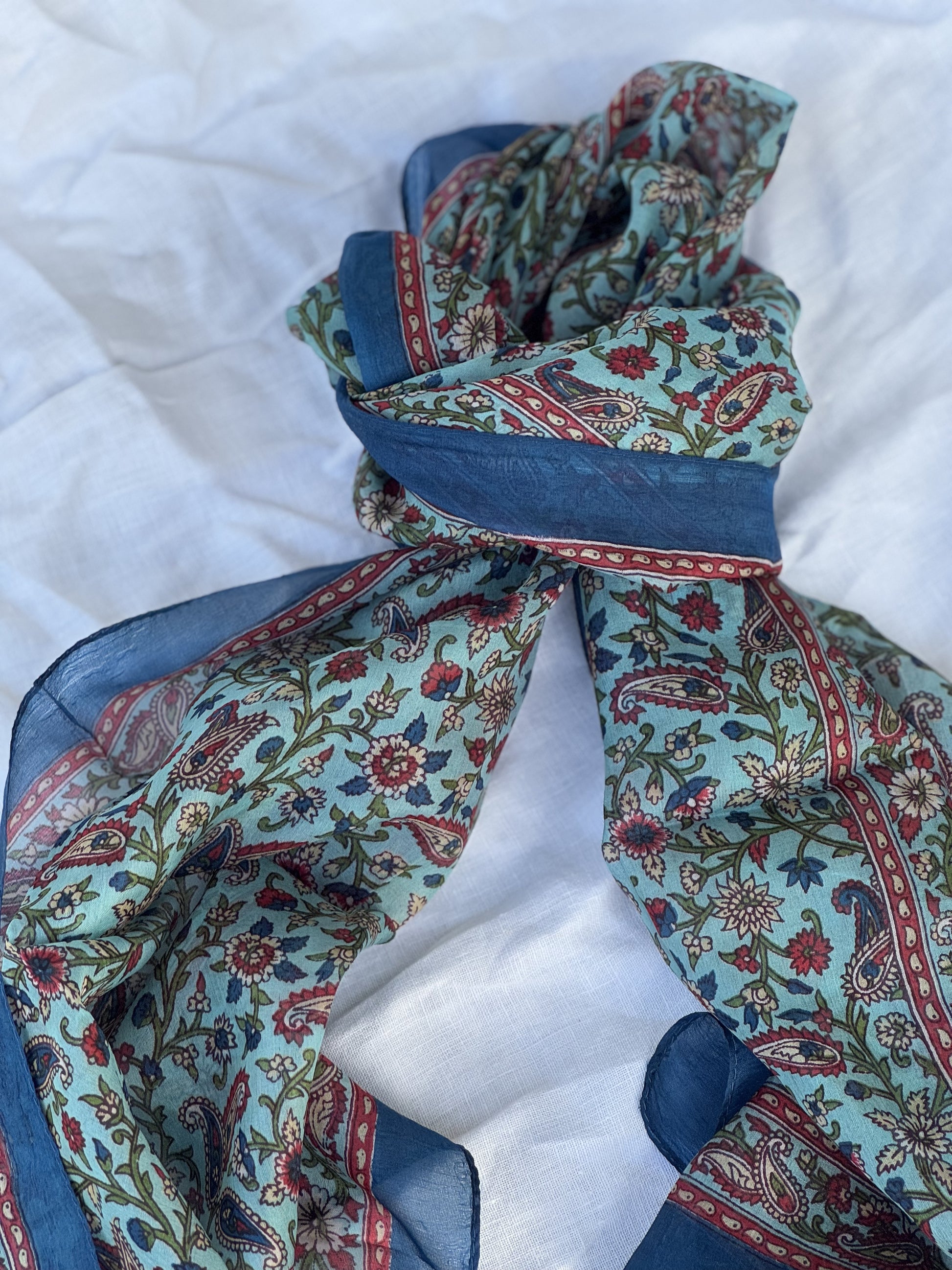 Skjerf i lett silke som måler 170x50cm. Faller pent rundt halsen, og kan brukes året rundt. En fin detalj som løfter ethvert antrekk. Kan knytes på mange forskjellige måter, og varmer godt dersom du surrer det flere ganger rundt halsen.