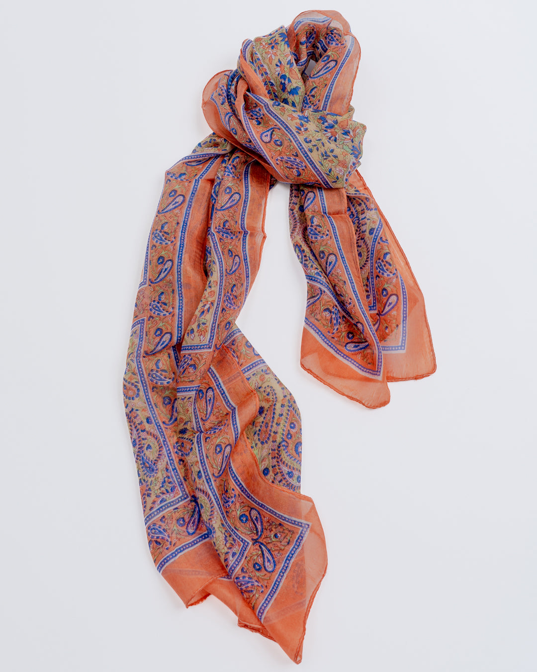 Skjerf i lett silke som måler 170x50cm. Faller pent rundt halsen, og kan brukes året rundt. En fin detalj som løfter ethvert antrekk. Kan knytes på mange forskjellige måter, og varmer godt dersom du surrer det flere ganger rundt halsen.