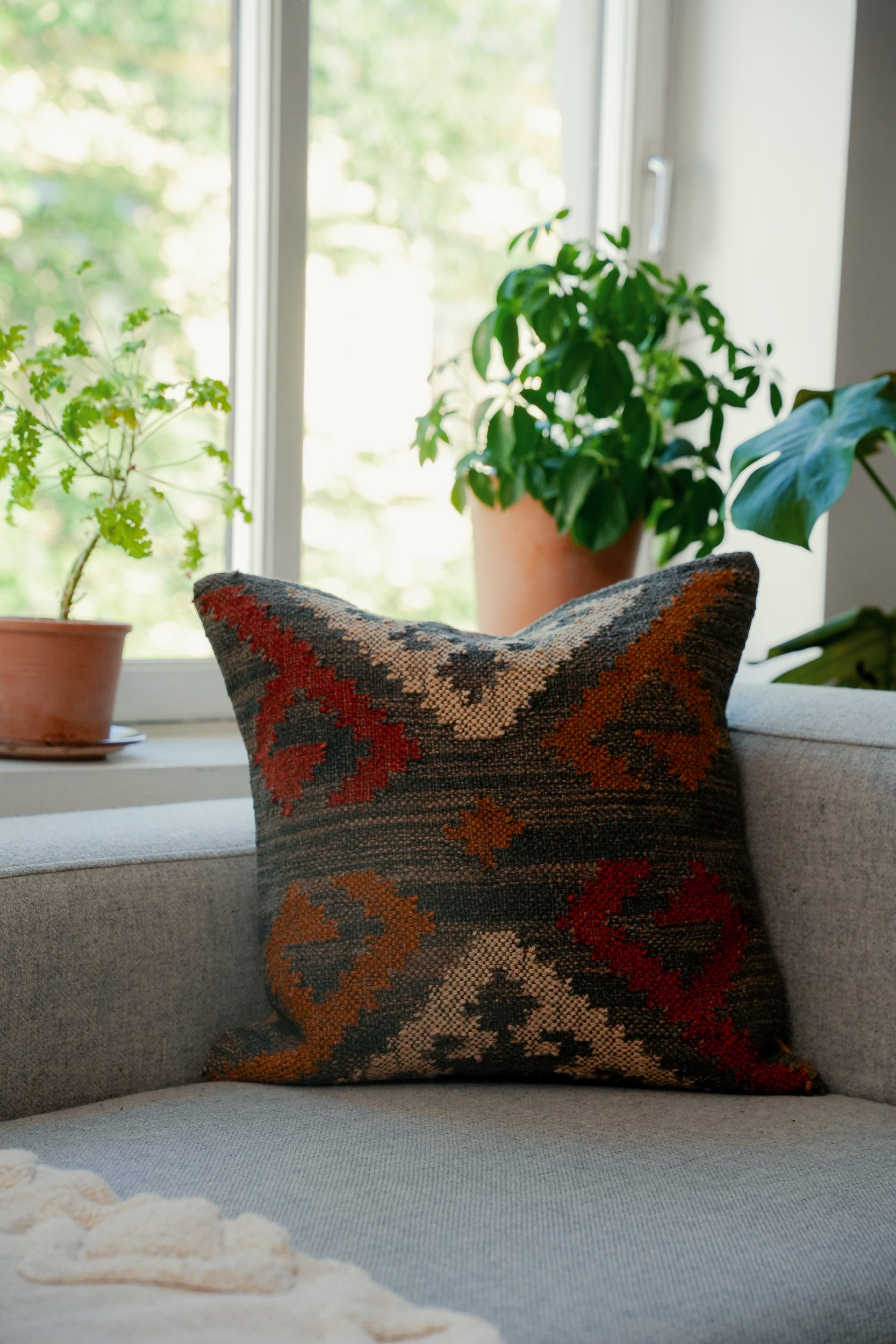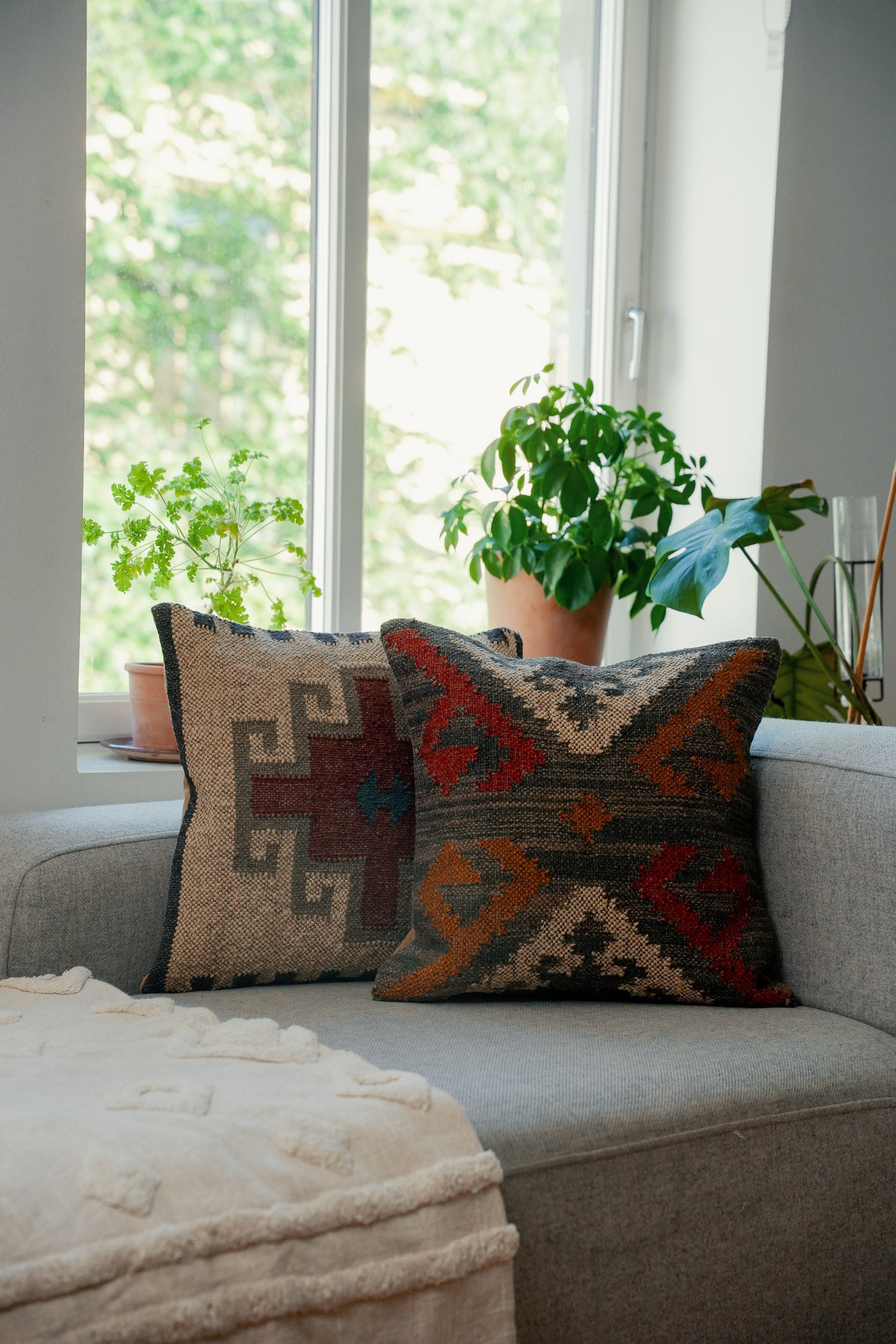 Putetrekk vevd i en kombinasjon av ull og jute, med en naturlig struktur og varme jordtoner. Hvert trekk har sitt eget uttrykk, inspirert av tradisjonelle kelim-mønstre. Baksiden er i bomull med glidelås.